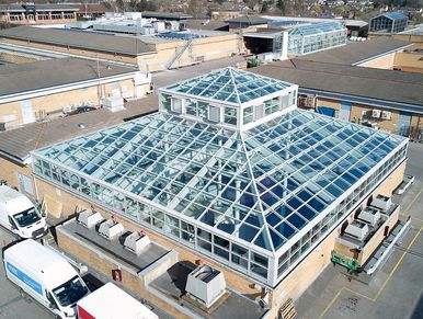 The centre features multiple large, glazed atriums and overhead canopies, which require regular maintenance and occasional replacement to ensure safety and enhance visual appeal.